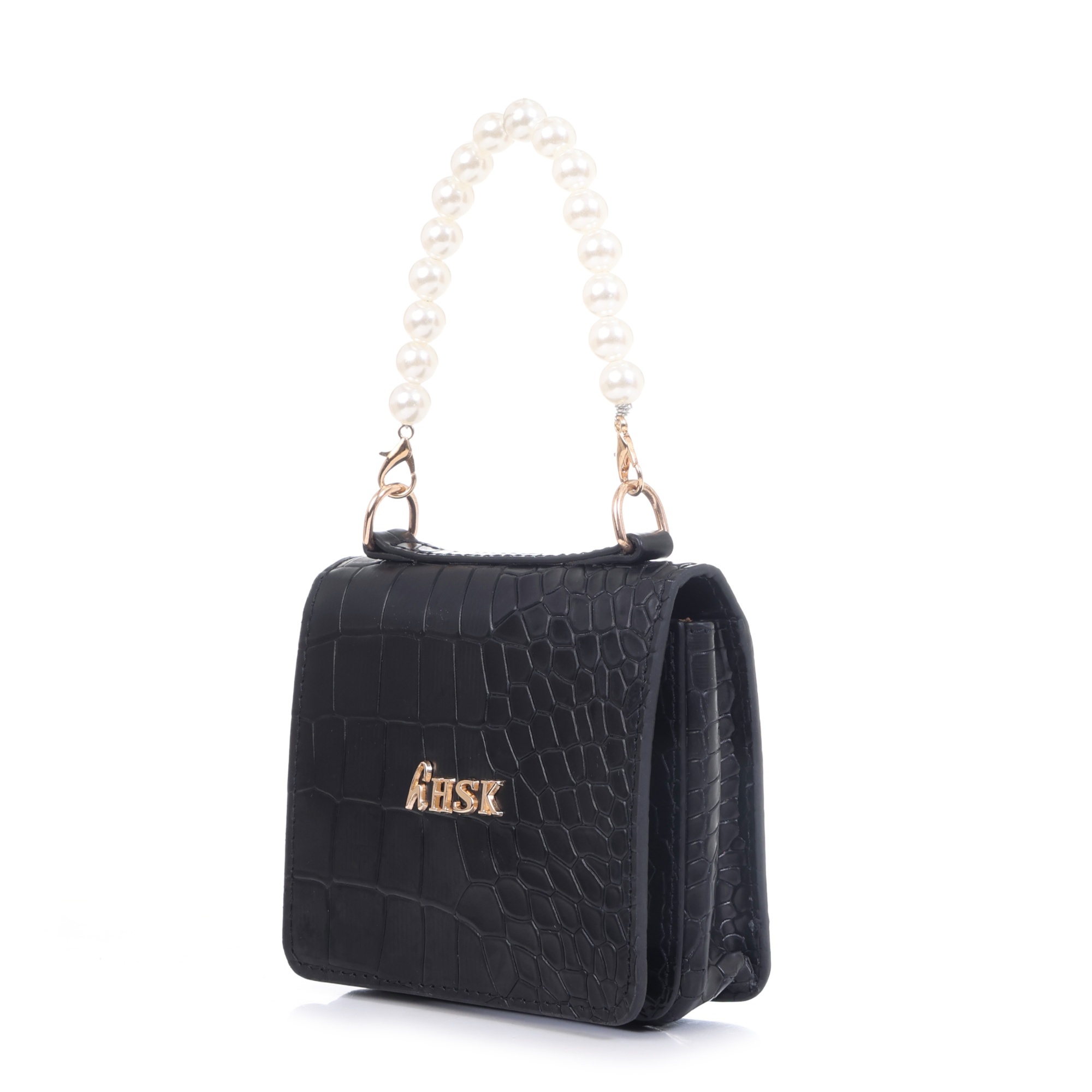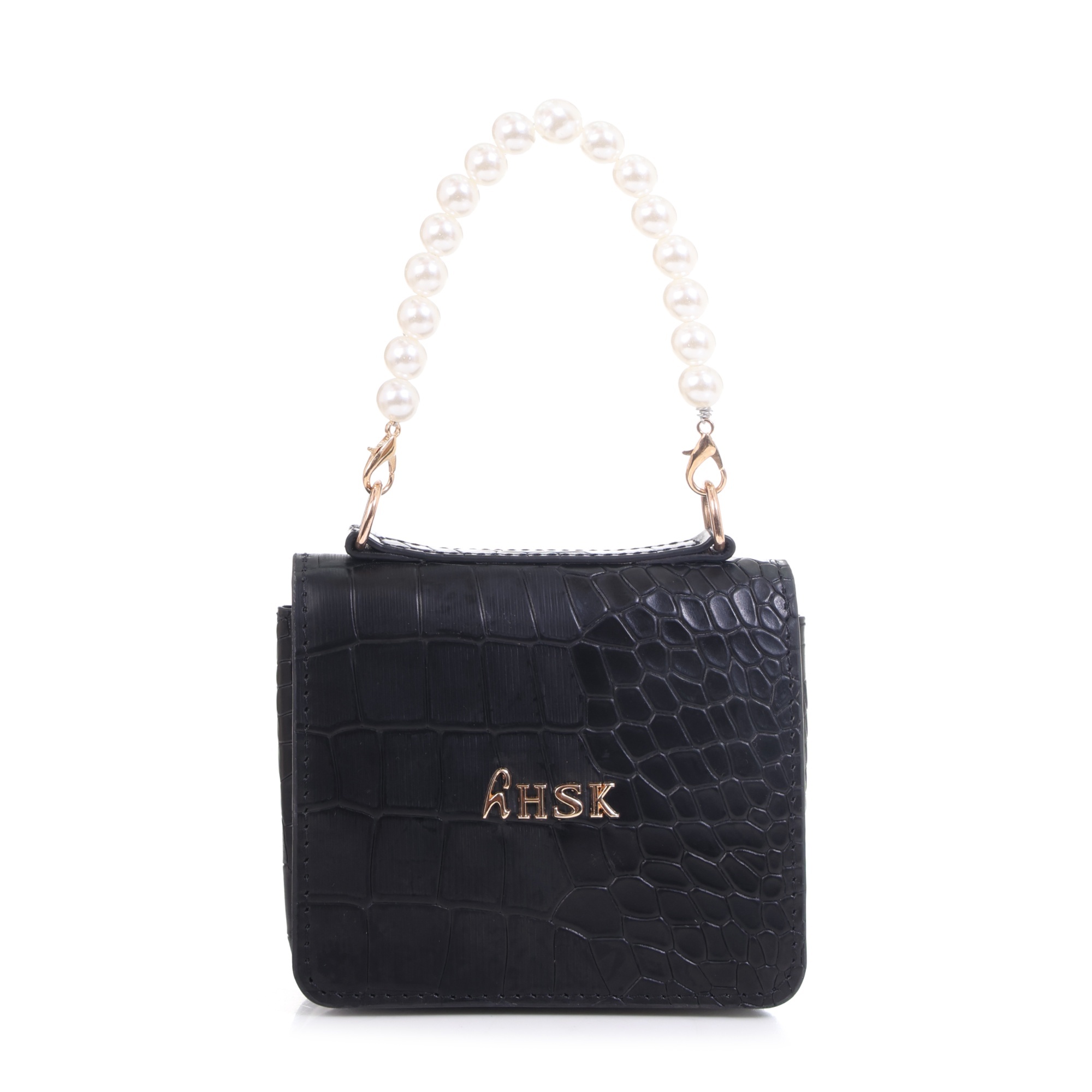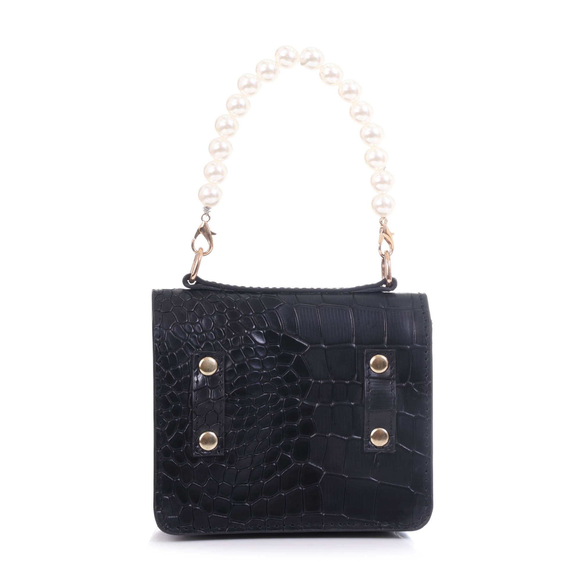 . Handle/Strap: Instead of a traditional leather strap, it features a unique and elegant top handle made entirely of pearls. These pearls are a creamy white, creating a beautiful contrast with the bold Black of the bag. The handle is attached by small silver-toned clasps, suggesting it might be detachable or interchangeable.
