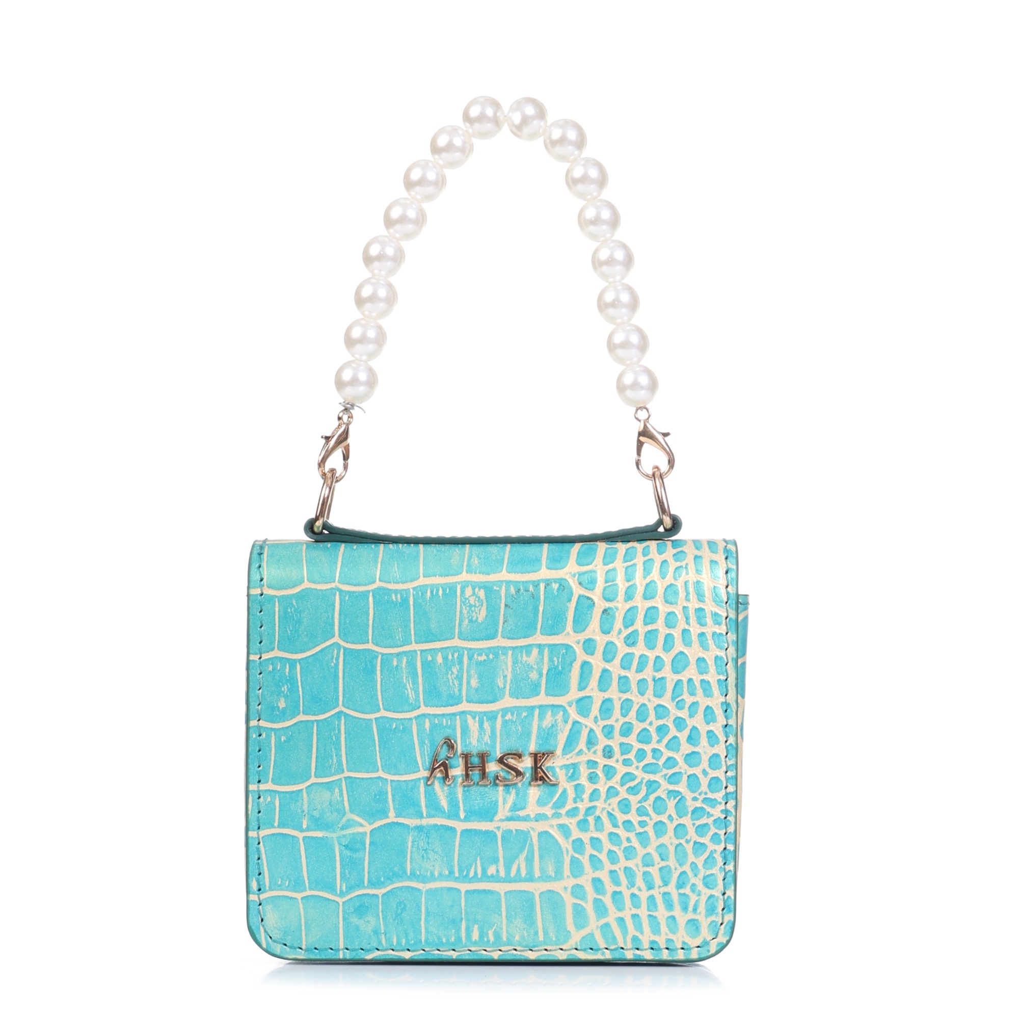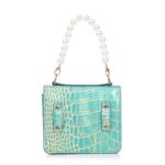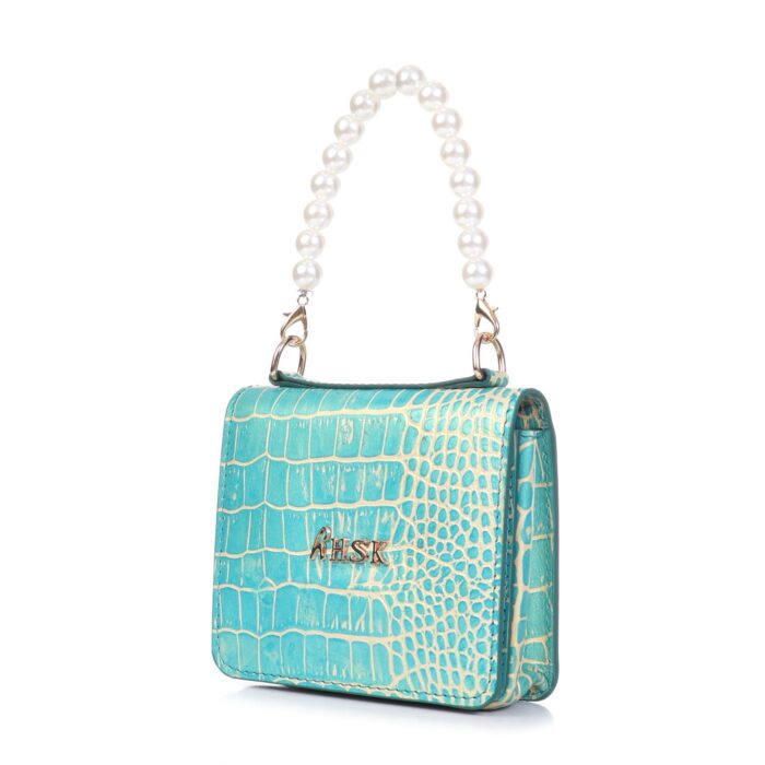 . Handle/Strap: Instead of a traditional leather strap, it features a unique and elegant top handle made entirely of pearls. These pearls are a creamy white, creating a beautiful contrast with the sky blue of the bag. The handle is attached by small silver-toned clasps, suggesting it might be detachable or interchangeable.
