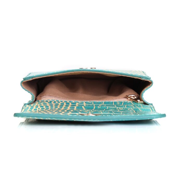 . Color: The dominant feature is its striking, Sky blue hue, which gives it a playful, modern, and eye-catching appeal. The leather appears to have a subtle pebbled or textured finish, characteristic of genuine leather.