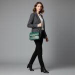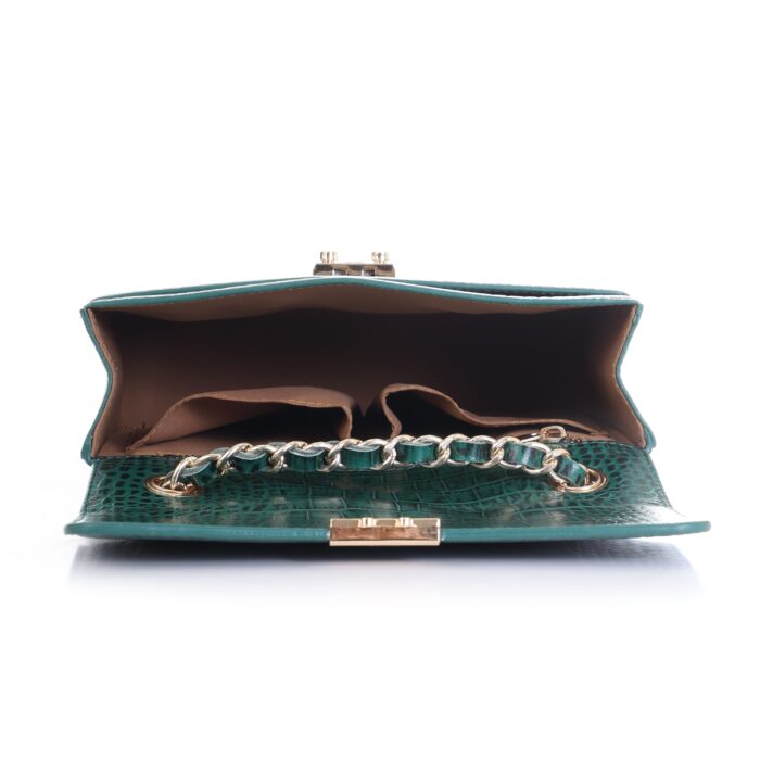 Material and Finish: Crafted from high-quality real leather, the bag boasts a striking emerald green color. The entire exterior is adorned with a detailed croc-embossed pattern, giving it a luxurious and exotic feel without compromising on ethical sourcing. This texture also adds depth and visual interest to the bag.