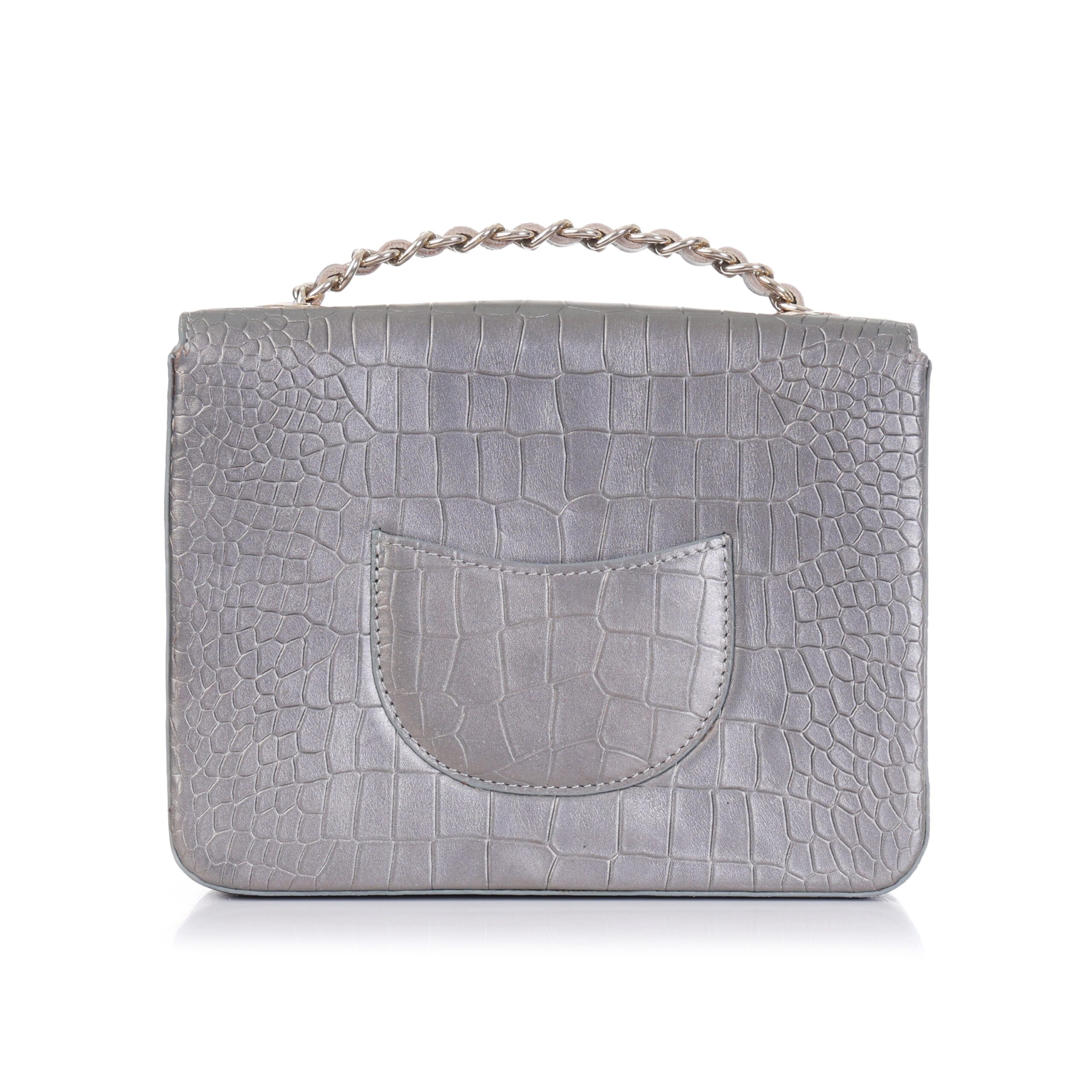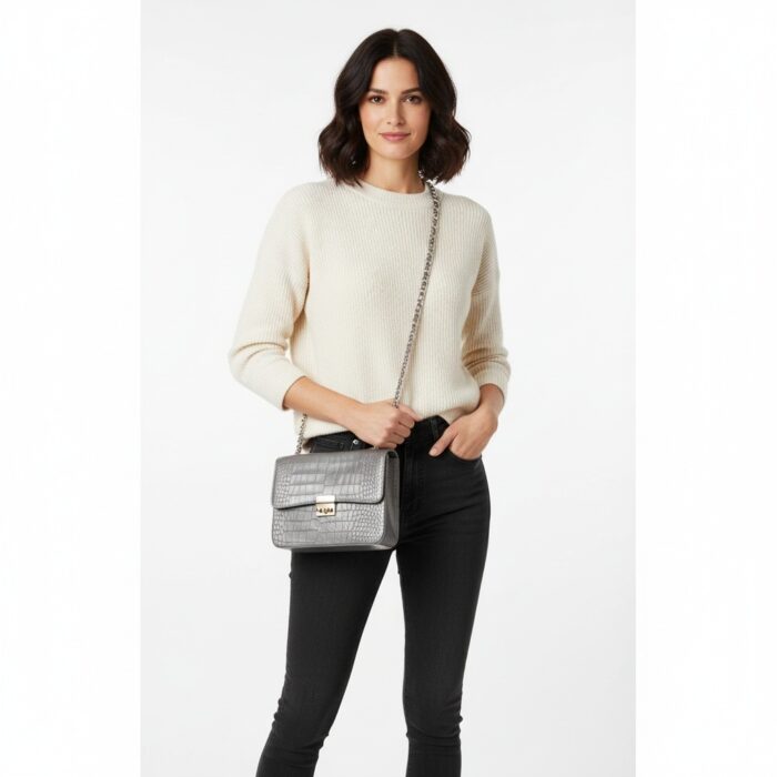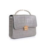 “Material and Finish: Crafted from high-quality leather, the bag boasts a striking emerald Grey color. The entire exterior is adorned with a detailed croc-embossed pattern, giving it a luxurious and exotic feel without compromising on ethical sourcing. This texture also adds depth and visual interest to the bag.