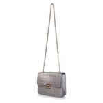 Hardware: The prominent gold-toned hardware, including the chic turn-lock closure and the elegant chain top handle, provides a beautiful contrast to the deep Grey leather. This metallic detailing enhances its high-end appeal and ensures secure closure.