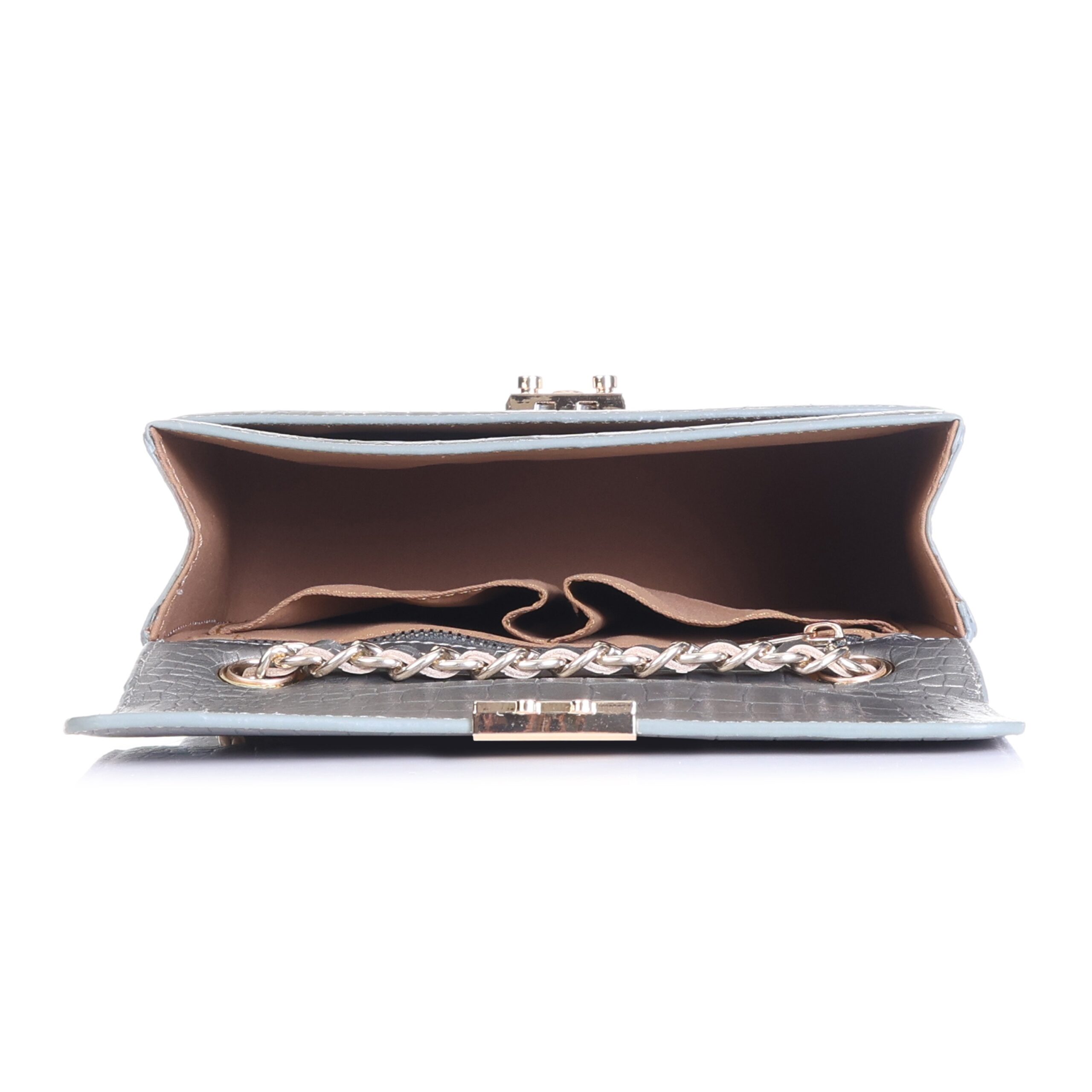 Interior: Typically, a bag of this style would feature a well-organized interior with compartments or pockets to keep essentials neatly arranged, such as a phone, wallet, keys, and cosmetics.”