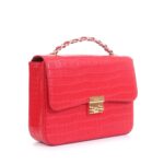 “Material and Finish: Crafted from high-quality leather, the bag boasts a striking emerald Red color. The entire exterior is adorned with a detailed croc-embossed pattern, giving it a luxurious and exotic feel without compromising on ethical sourcing. This texture also adds depth and visual interest to the bag.