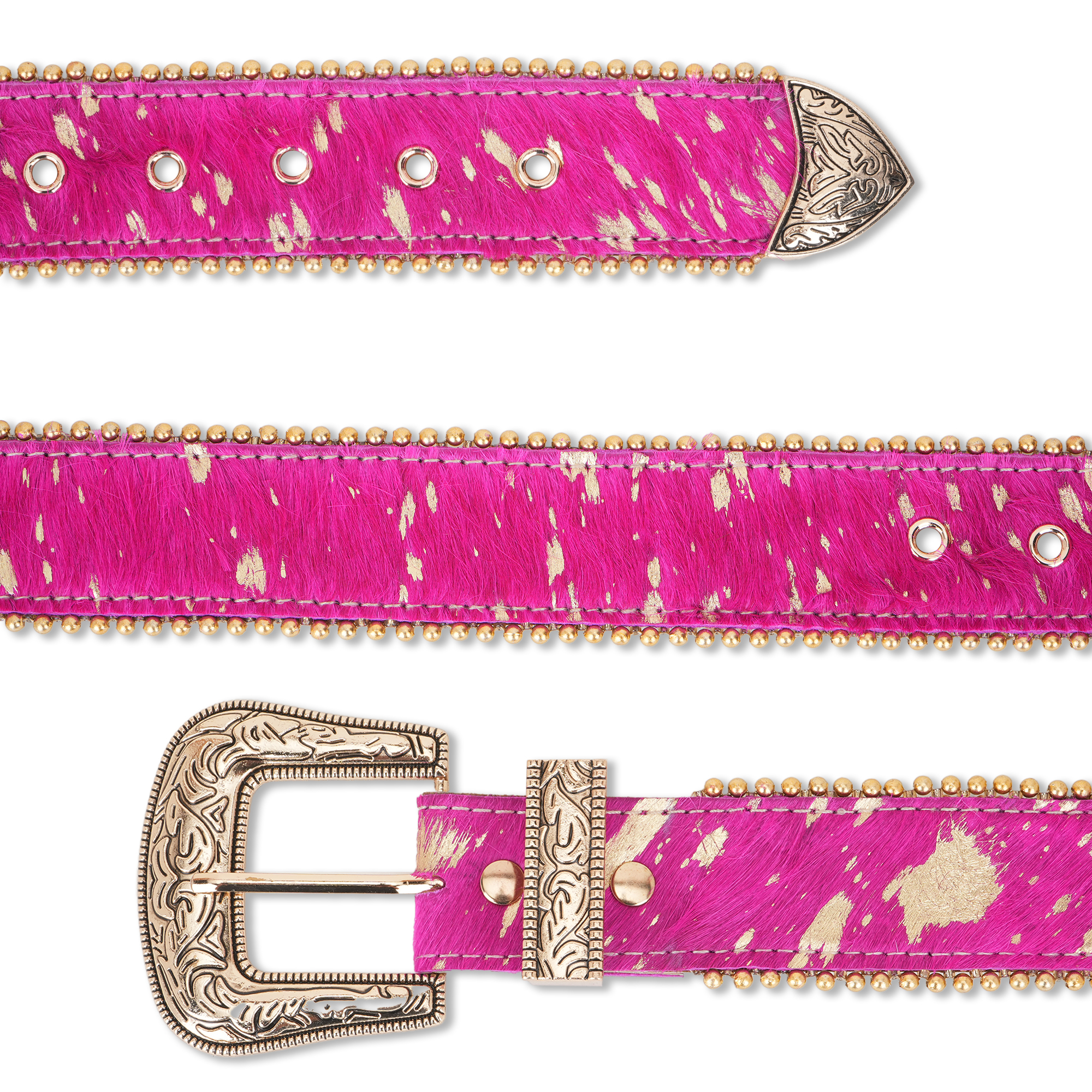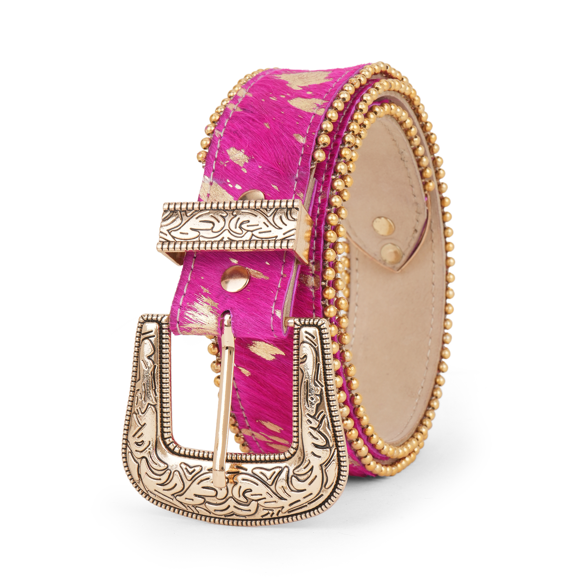 Hardware: Heavy-duty antique gold-tone buckle and loop with intricate Western floral and scroll engraving