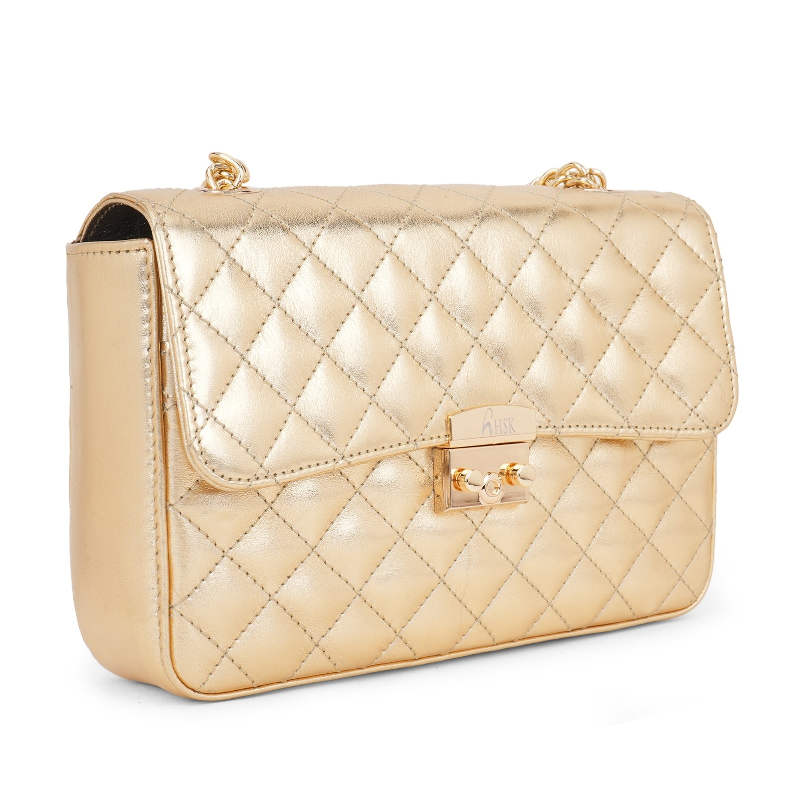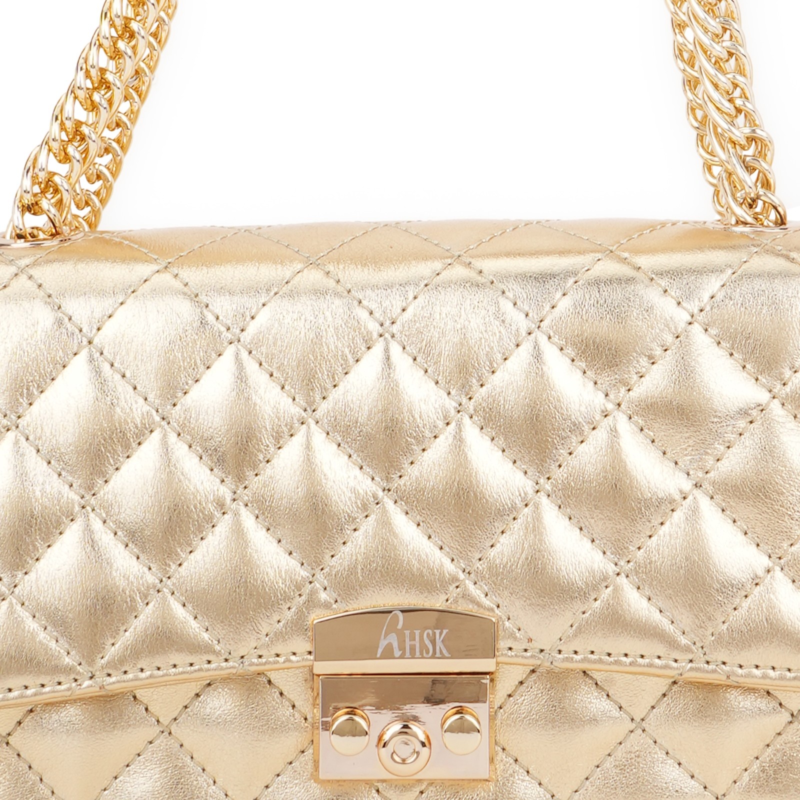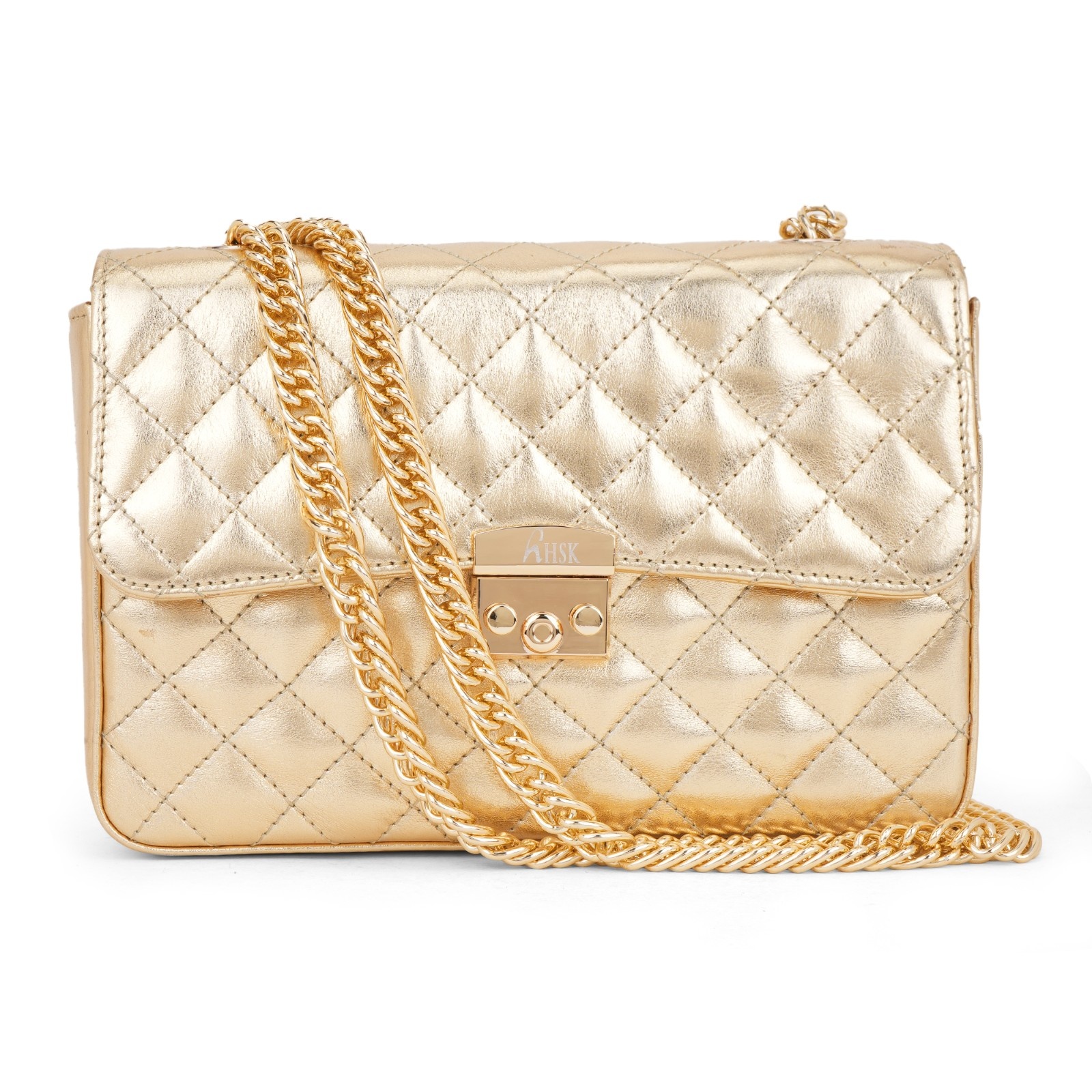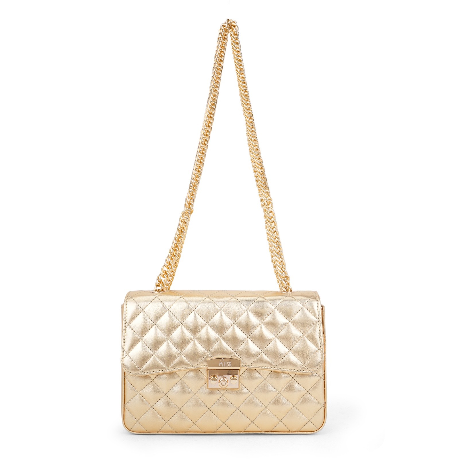 Hardware: It is equipped with a matching gold-tone chain strap and a secure push-lock clasp engraved with “”hHSK”” branding.